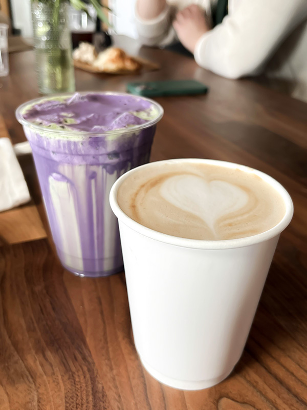 My bud got the seasonal (?) matcha ube latte and I got the “New Moon” latte (a sort of sesame latte) with oatmilk (they use Minor Figures!) My latte was so nice and warm, and super tasty! I was a little surprised at how sweet it was since I think this seems like one of those coffeeshops that aren’t too sweet, but I suppose it was a limited seasonal fun option.