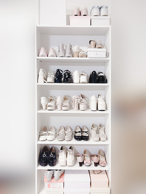 Recently, I finally cleaned up my shoe cabinet so it wasn’t so messy. The long boots are in the bottom boxes along with some off-season shoes. On top of the Billy bookcase, I put some huge platforms that I don’t wear much.