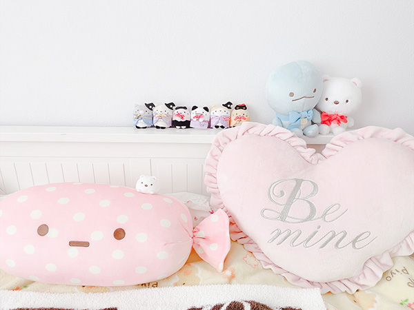 I finally got a chance to put up the Halloween Sumikko that my dad brought back from Hong Kong for me Right now, I don’t have any shelves, so I put them on my bed ledge. I think they probably like to hide behind the pillows.