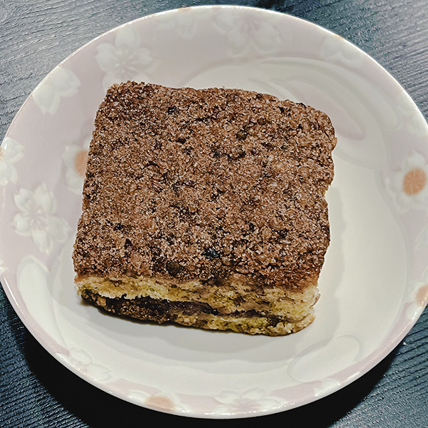 We got a treat today: coffee streusel cake! It was a perfectly small portion to share since neither of us wanted to commit to eating anything too filling, but it was just a good bite size It was really delicious and definitely a good pick-me-up for such a chilly and gloomish day! We had it with Sloane Heavenly Creme tea