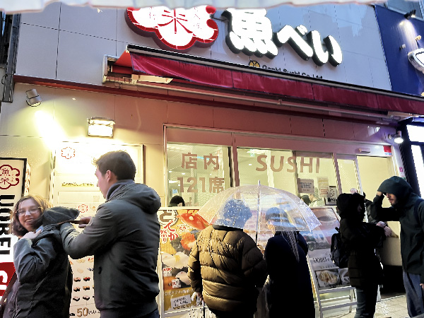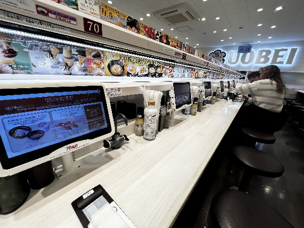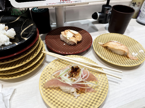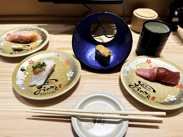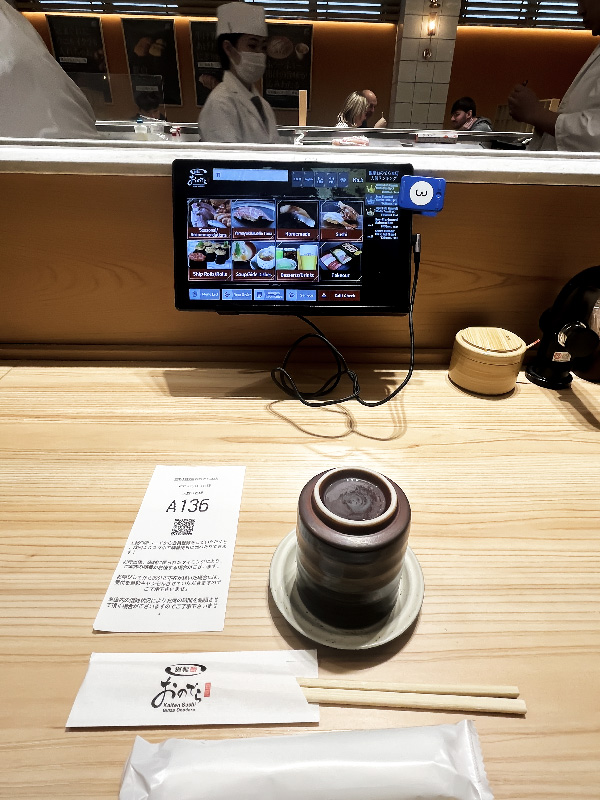 This is a “conveyor belt sushi” place, but rather than the sushi options rolling around on belts for you to pluck for eating, you order via a tablet and it is zoomed to you via the belt! In my case, I sat near the sushi chefs so they just handed it to me directly