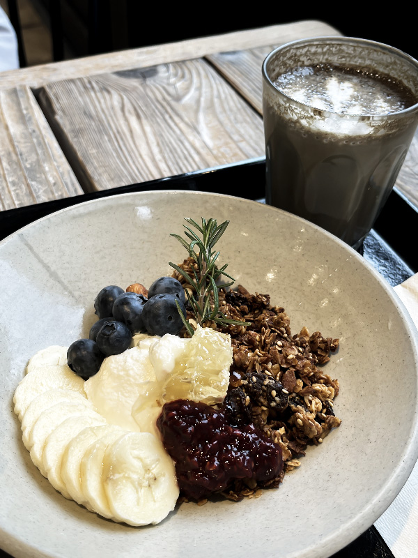 This time, I went for a sweet breakfast of their greek yoghurt + housemade granola & jam and a hot houjicha latte. It came with a little honeycomb on top as well!