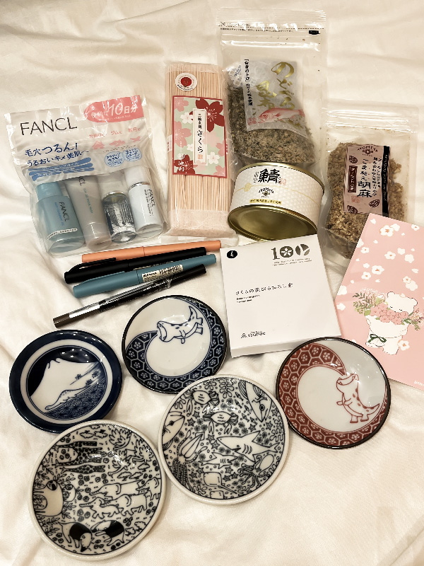 Here were the buys from today (somehow missing the cat mold in photo) Aren’t those “traditional style” dinosaur soy sauce dishes so cute??? I got furikake and canned mackerel for the manz and sakura flavoured soba for myself. Also, since my travel set of face wash was running low, I got the FANCL set from the konbini.